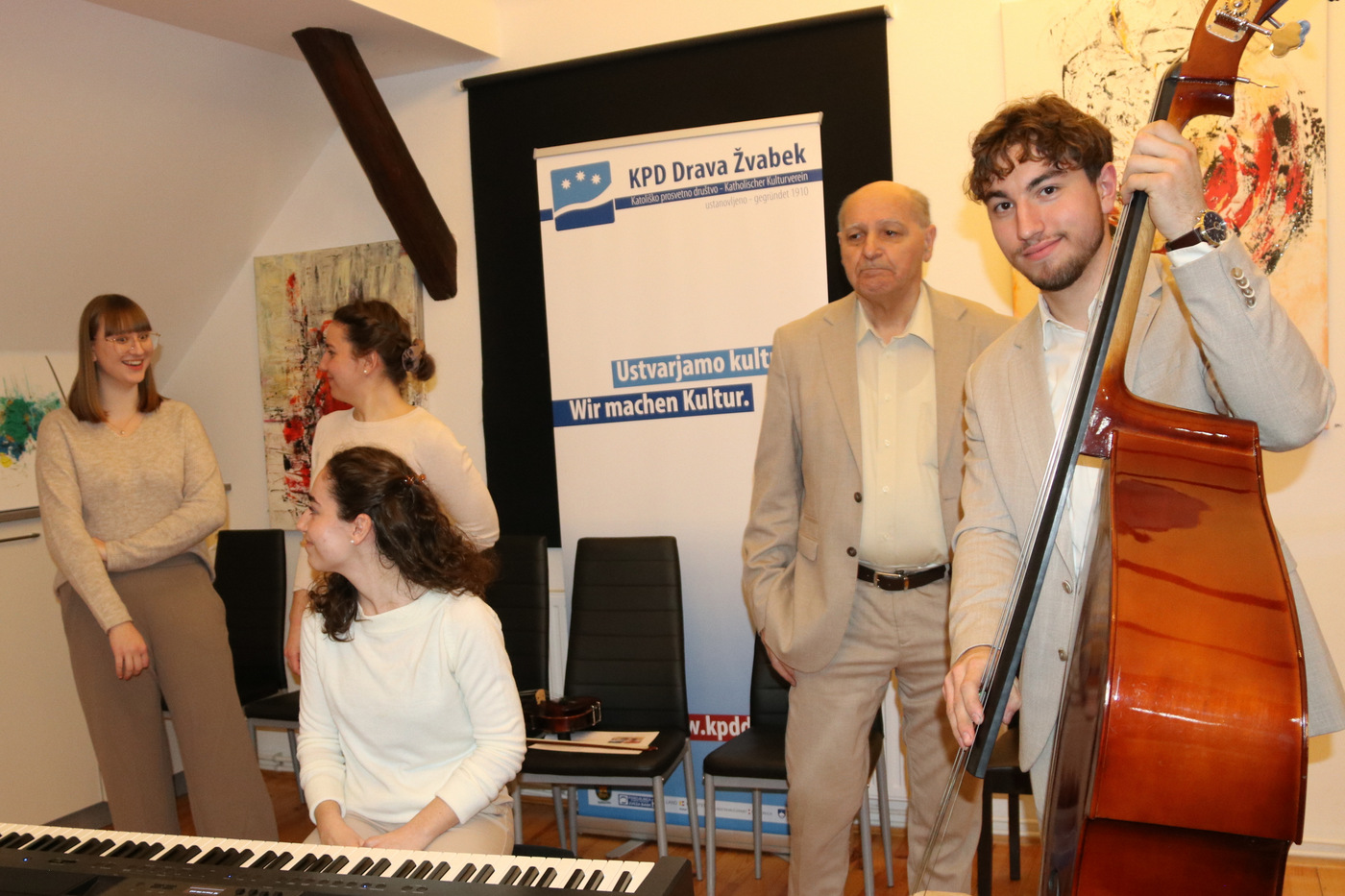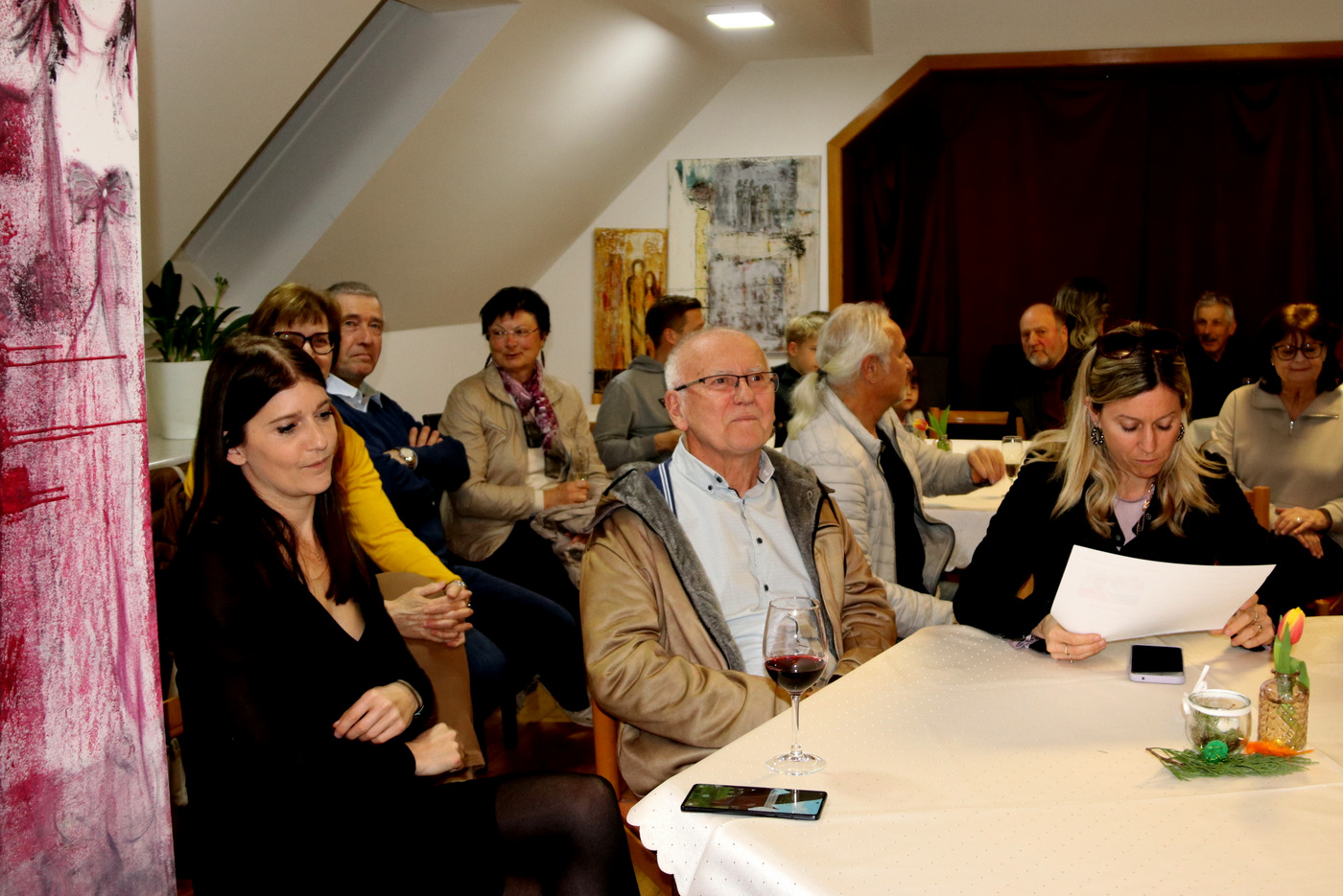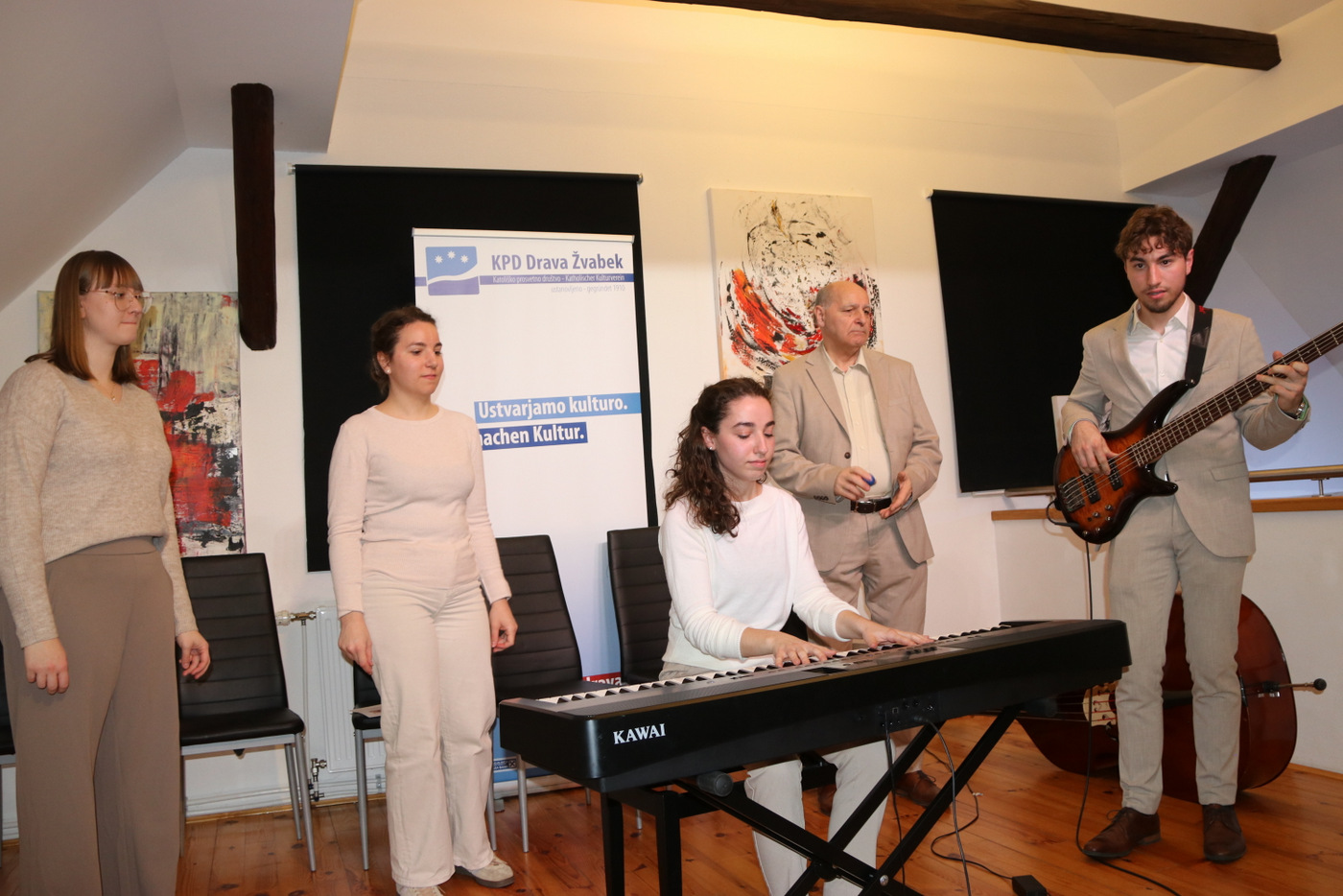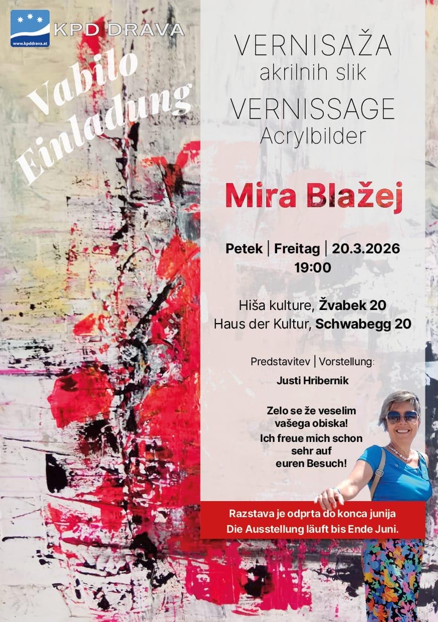 Am Freitag, den 20. März 2026 lud das Kulturhaus Hiša kulture in Schwabegg/Žvabek zur Vernissage der Künstlerin Mira Blažej aus Gallizien/Galicija ein. Nach der Begrüßung durch Obmann Jokej Logarf begann die Veranstaltung mit einer Vorstellung der Künstlerin durch Justi Hribernik. Musikalisch wurde der Abend von der Gruppe Skupina Sanje aus Neuhaus/Suha begleitet. Unter den zahlreichen Besuchern waren viele Freunde und Verwandte der Künstlerin, Künstlerkolleg:innen aus dem gesamten Bezirk sowie zahlreiche Ehrengäste.