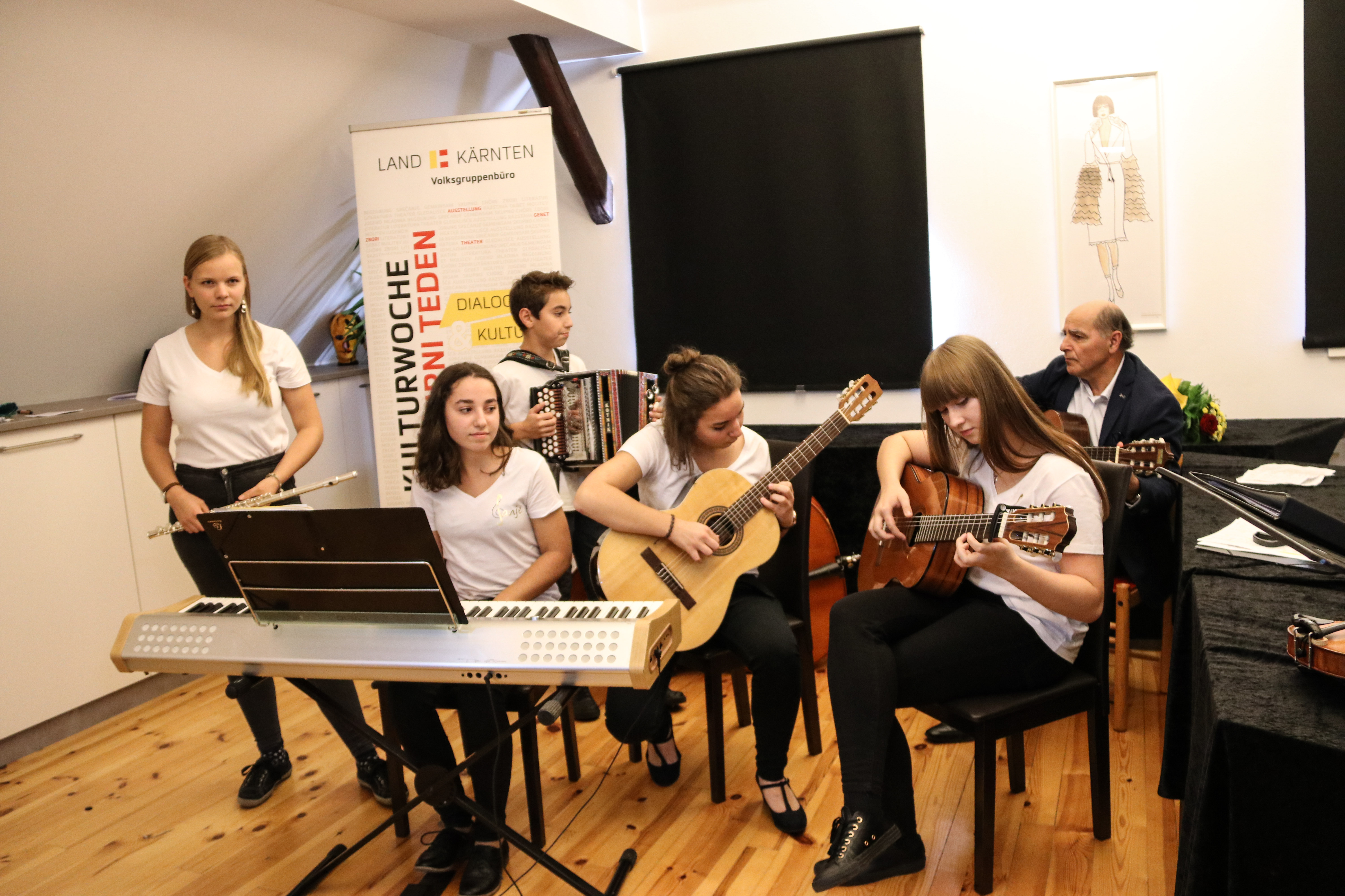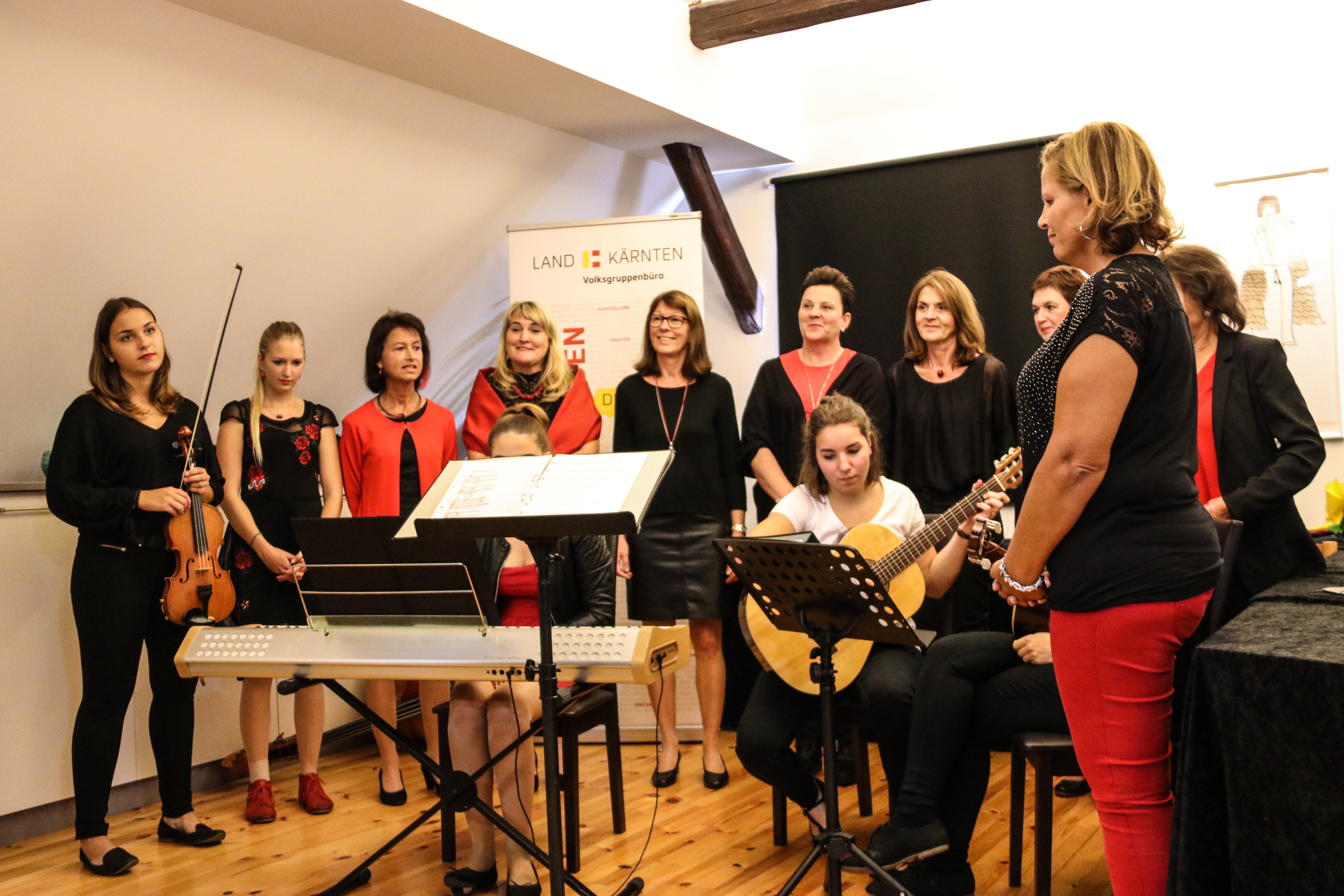 Die Ausstellungseröffnung „Kunst & Mode“ im Rahmen der Kulturwoche des Landes Kärnten war ein voller Erfolg. Die Ausstellung der beiden Künstlerinnen erweckte bei den zahlreichen Besuchern großes Interesse. Musikalisch umrahmt wurde die Vernissage von der Gruppe „Sanje“ unter der Leitung von dr. Engelbert Logar sowie vom Chor „Pevsko-instrumentalna skupina“, geleitet von Vera Sadjak. Instrumentalbegleitung: Alina Logar, Klara Logar, Timna Katz, Nina Kogelnik. Die Ausstellung ist bis Ende November zu besichtigen. Telefon: 0664 55 32 845