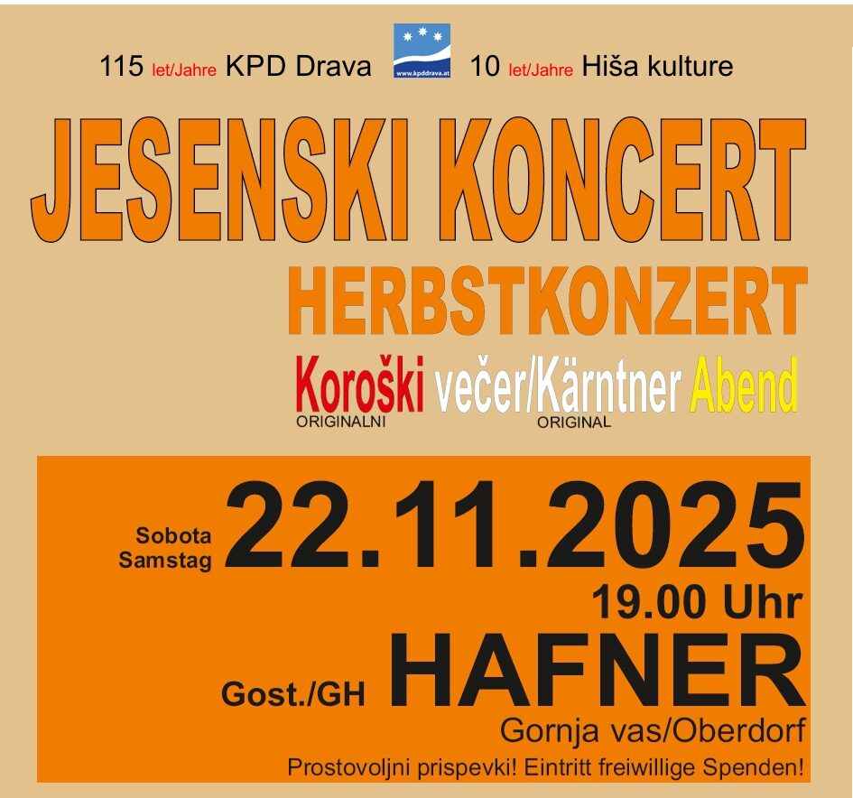 Das traditionelle Herbstkonzert & original Kärntner Abend findet am Samstag, dem 22. November um 19:00 Uhr im Gasthof Hafner in Oberdorf/Gornja vas statt. Mitwirkende sind neben den heimischen Gruppen PIS Žvabek, Skupina Sanje und Oktet Suha noch die Gastgruppen Jugendchor Sweethearts aus Eberndorf/Dobrla vas sowie Lavantklang aus dem Lavanttal. Alle sind herzlich dazu eingeladen!